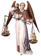 The following are other allegorical symbols of the personal fight to overcome obstacles, interefences, and all negative influences that can harm the Spirit. The allegorical image of Michael the Archangel is a perfect symbol for the personal fight against all interences to growth. Some images have Michael fighting against a demon, others protray him with a balance scale, measuring the 'weight' of souls. Those found 'light' would get their positive reward. Some images portray Michael with both a sword fighting a demon and a balance scale. I have also taken license and altered a few of the original images. |